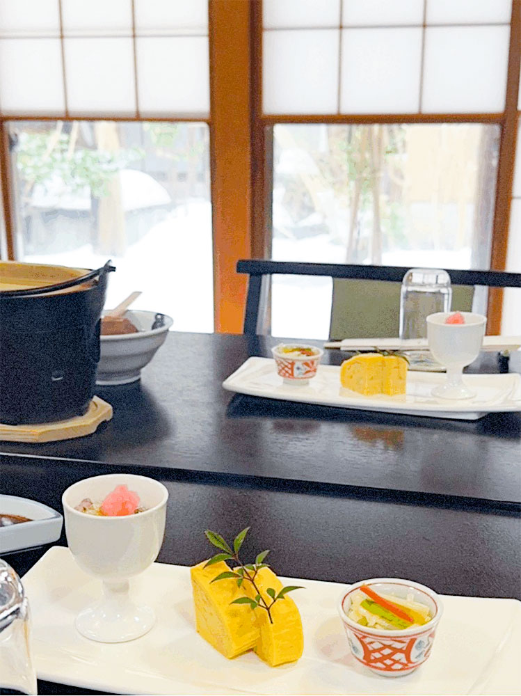 雪景色のお庭を望むお座敷にて開催いたしました。手入れの行き届いた庭からも、おもてなしの心を感じるひとときでした。