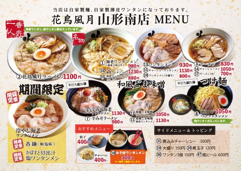 花鳥風月の冬といえば毎年恒例の激辛ワンタンメン。毎年テーマが変更され味と具材がリニューアルされます。その年限定の味をお楽しみください。